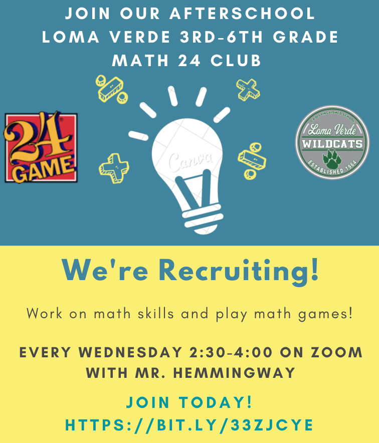 We are looking for students to join the after-school 3rd-6th grade Loma Verde Math Club!