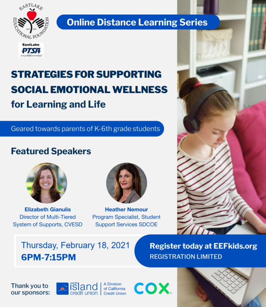 Thursday, 2/18 6:00-7:15 Online Distance Learning Series Strategies for Supporting Social Emotional Wellness for Learning and Life (see flyer above)