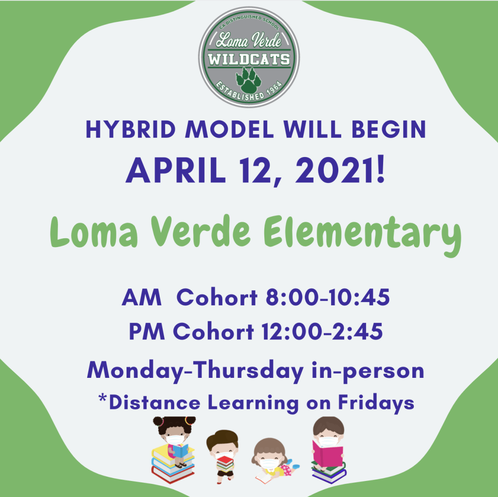 The staff and I are excited to welcome our students back on campus! We look forward to seeing our Loma Verde Wildcats in person. Safety protocols are in place. The in-person, hybrid instructional model for students will begin on Monday, April 12. We are finalizing rosters for in-person AM and PM cohorts and distance learning. You will be notified during the week of April 5 of your child’s hybrid/distance learning class.
