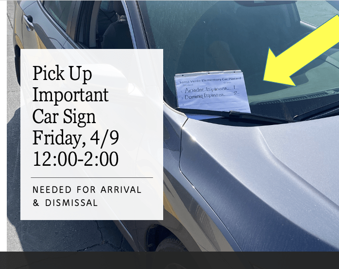 Please stop by the school between 12:00-2:00 on Friday, April 9 to pick up your sign for your car, and pick up important forms. This will help with our traffic flow, identify which child you are picking up, and how they are getting home. Thank you!