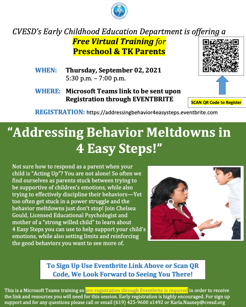 - Thursday, 9/2 – 5:30-7:00 PM – CVESD Parent Workshop: Addressing Behavior Meltdowns in 4 Easy Steps (virtual training – see flyer below)