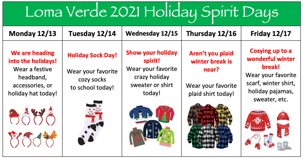 - Monday, 12/13 – Friday, 12/17 Loma Verde Holiday Spirit Days