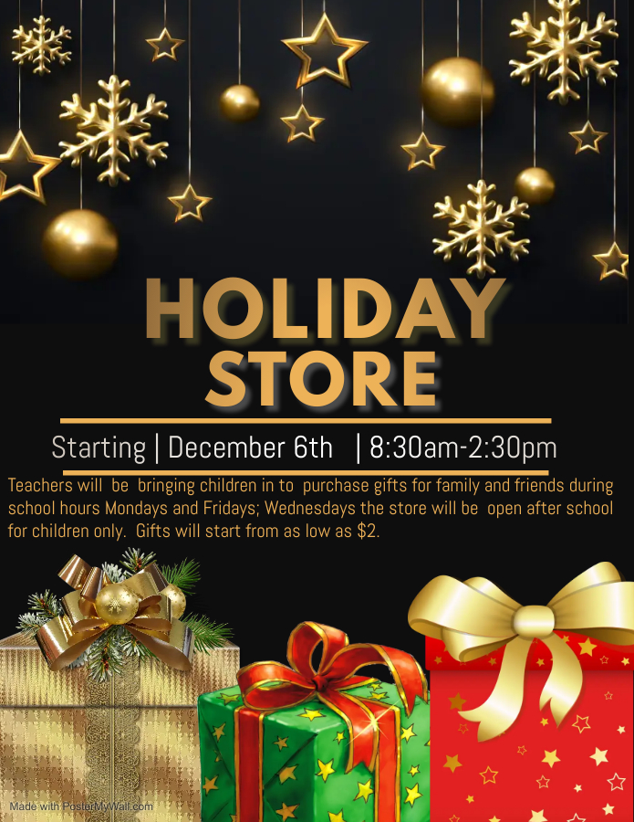 The holidays are coming and we want to help make the season even more special for your children by giving them the opportunity to shop (in secret!) for the perfect gift for Mom, Dad, grandparents, siblings, and other important people in their lives. A flyer will send home along with an envelope to help with gift budgeting for your student. Holiday Shop will be open during school Mondays and Fridays and Wednesday after school.