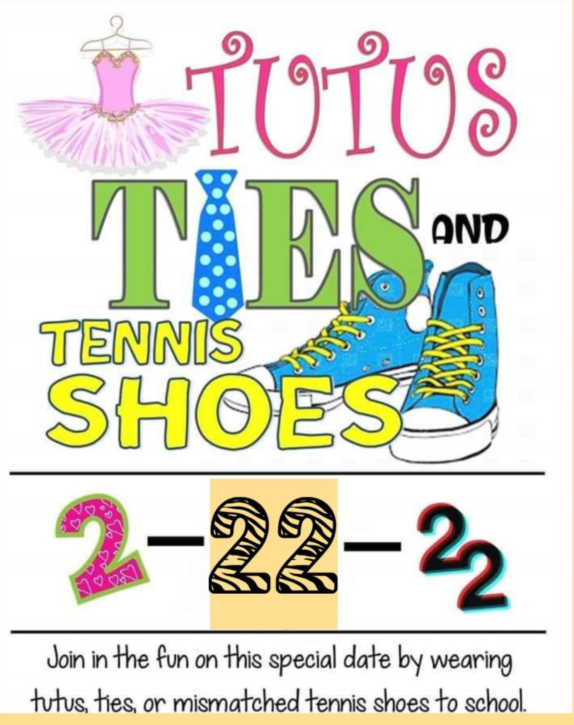 - “Twosday” 2/22/22 Tutus, Ties, & Tennis Shoes Spirit Day!
