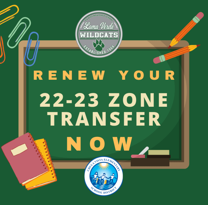 You should have received an email from School Messenger regarding how to renew your Zone Transfer. Please check your spam, and make sure you don’t have this email address blocked. It is very important to renew this form as soon as possible to ensure your child will be placed in a class for the 2022-2023 school year. Email lomaverdeschool@cvesd.org with questions. Thank you!