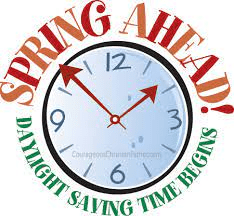 - Sunday, 3/13 – Day Light Savings Time Begins (Turn clocks ahead 1 hour)