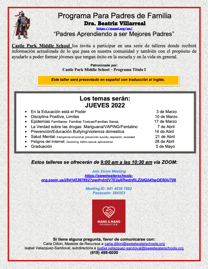 Castle Park Middle School invites you to participate in a series of workshops where you will receive updated information on what is happening in our community and with the purpose of helping you raise successful young people in school and life in general.