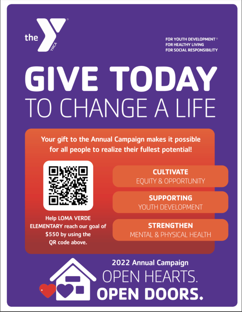 Please help us reach our goal of $550 to help support the YMCA. Every little bit helps, even a few dollars! Donations go toward the STRETCH program, camps, scholarships, and other beneficial YMCA programs for our community. You can share the flyer below with family and friends. Use the QR code to easily access the donation page. We greatly appreciate all the YMCA does to support Loma Verde families and the community. Thank you! Click here to donate: https://www.classy.org/fundraiser/3743094