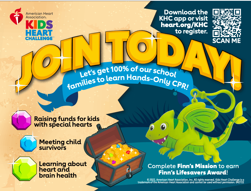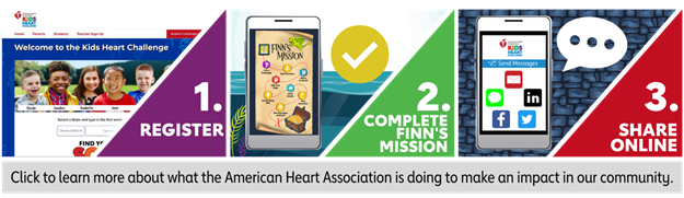Dear Families – Our Kids Heart Challenge is off to a great start, and we are having a wonderful time learning how to keep our hearts and minds healthy! If you haven’t yet, join our KHC team today! Be part of the movement and join the 1.8 million families across the nation who are learning the life-saving skills of Hands-Only CPR by completing Finn’s Mission! Thank you for supporting our school and this life-saving program!