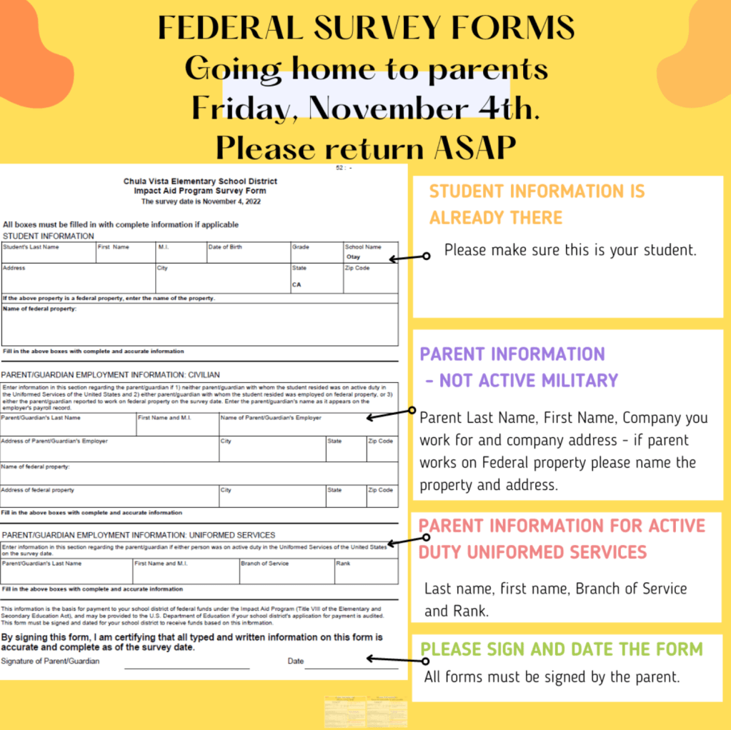 Federal funds are provided to the school district based on the number of students enrolled in our schools whose parents/guardians reside or work on Federal Property or are on active duty in the military. Send the completed form by email to lomaverdeschool@cvesd.org or drop it off at the school office Monday-Friday between 7:30-4:00. This form will be sent home this week to parents/guardians. See below how to complete the form. Thank you!