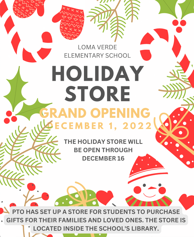 The PTO Holiday Shop is back at Loma Verde this year! It will be open from Thursday, December 1 through Friday, December 16 in the library. This is an opportunity for students to purchase inexpensive gifts for their friends and family. All the proceeds go to the Loma Verde PTO and benefit all of our scholars. We are looking for more parent volunteers to help out. If you can spare an hour or two during one or more of the days, please contact Monica Crespo at monycr8@hotmail.com. Thank you!