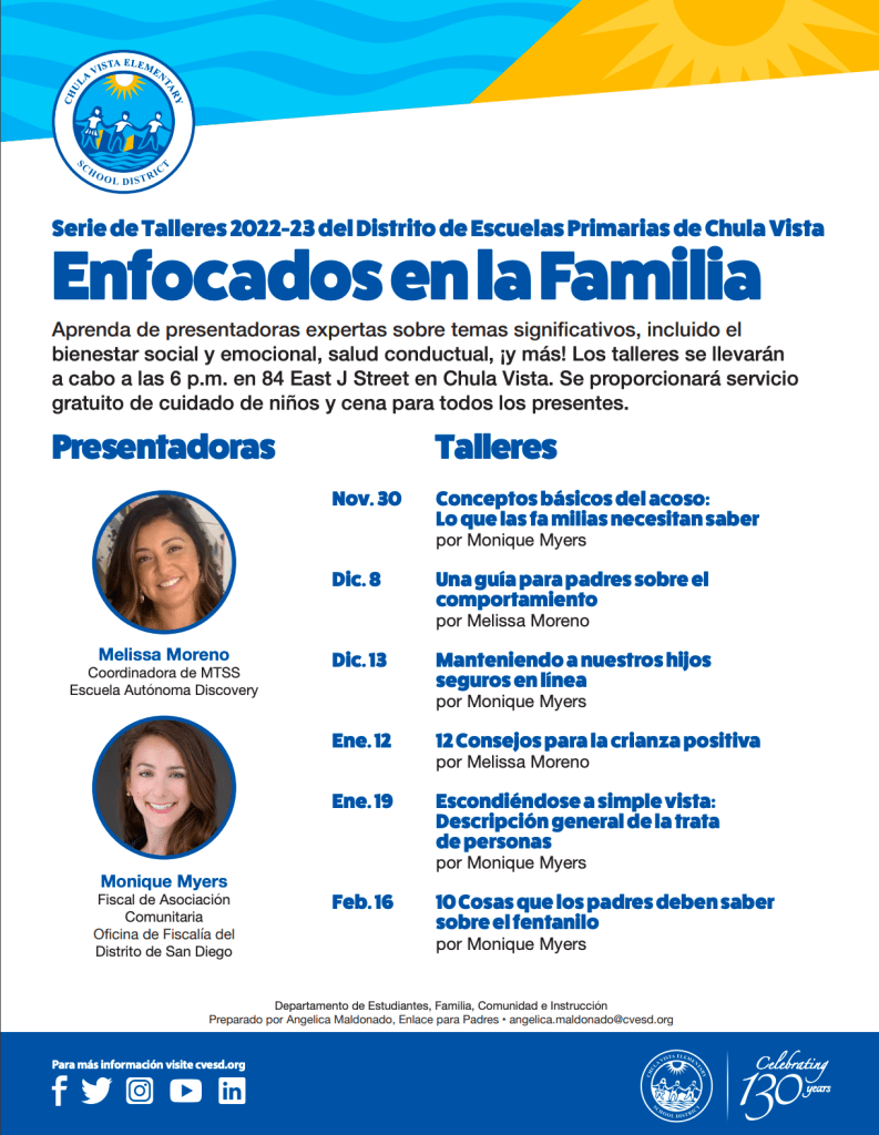 The Chula Vista Elementary School District is starting a new Family Focus Series for families to learn more about pressing topics such as bullying, social and emotional well-being, and more! This is a wonderful learning opportunity for our families to participate in upcoming workshops. Check out all the topics below! Free childcare and dinner are provided for all attendees. The next workshop is on January 12. The MTSS Coordinator for Discovery Charter School, Melissa Moreno, will present “12 Tips for Effective Parenting.”