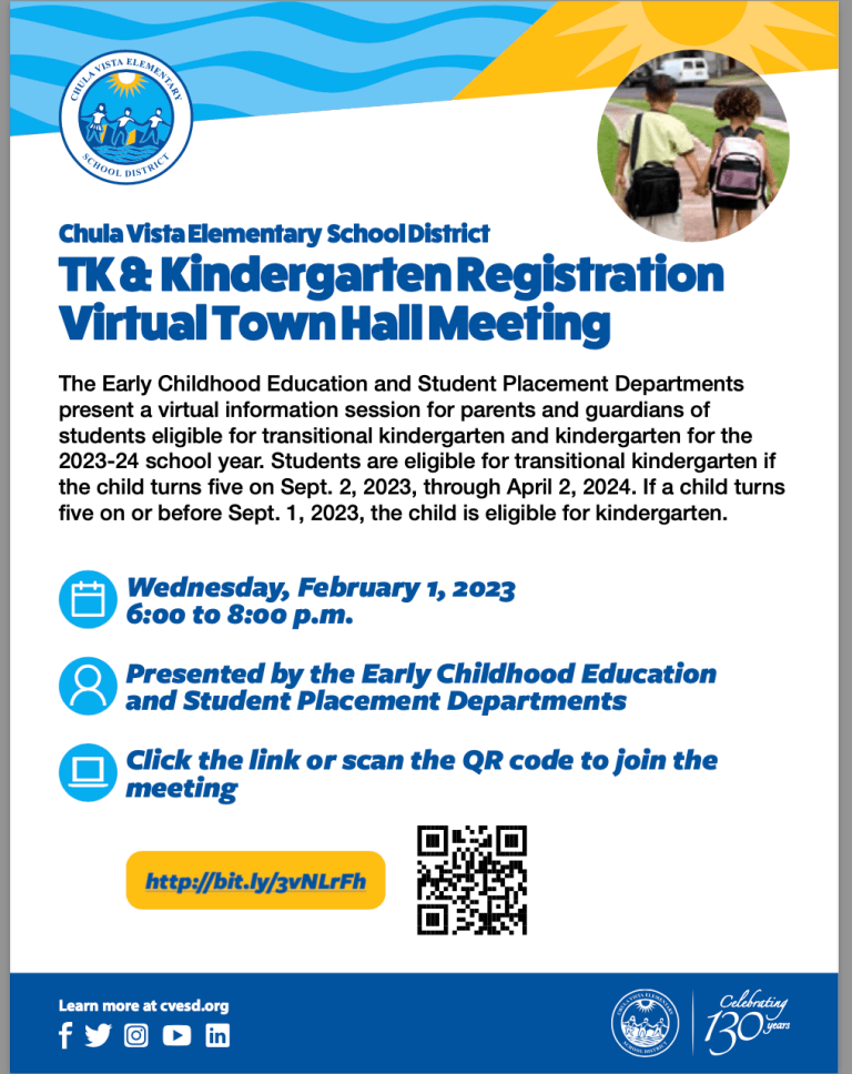 - Wednesday, 2/1 6:00-8:00 p.m. TK & Kinder Registration Virtual Town Hall Meeting