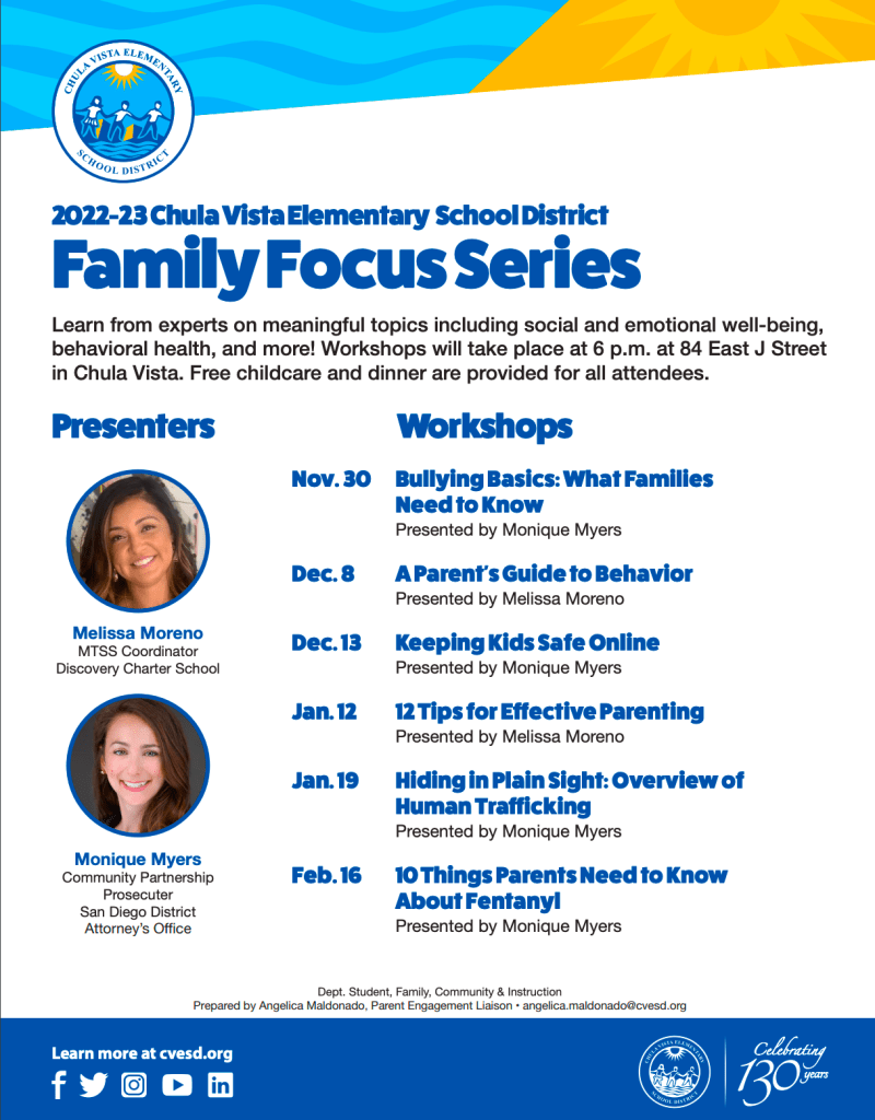 The Chula Vista Elementary School District is starting a new Family Focus Series for families to learn more about pressing topics such as bullying, social and emotional well-being, and more! This is a wonderful learning opportunity for our families to participate in upcoming workshops. Check out all the topics below! Free childcare and dinner are provided for all attendees. The next workshop is on February 16 called “10 Things Parents Need to Know About Fentanyl.”