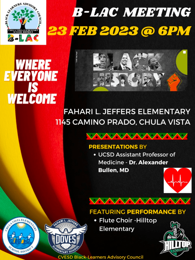 - Thursday, 2/23 6:00 p.m. B-LAC Meeting CVESD Black Learners Advisory Committee @ Jeffers Elementary