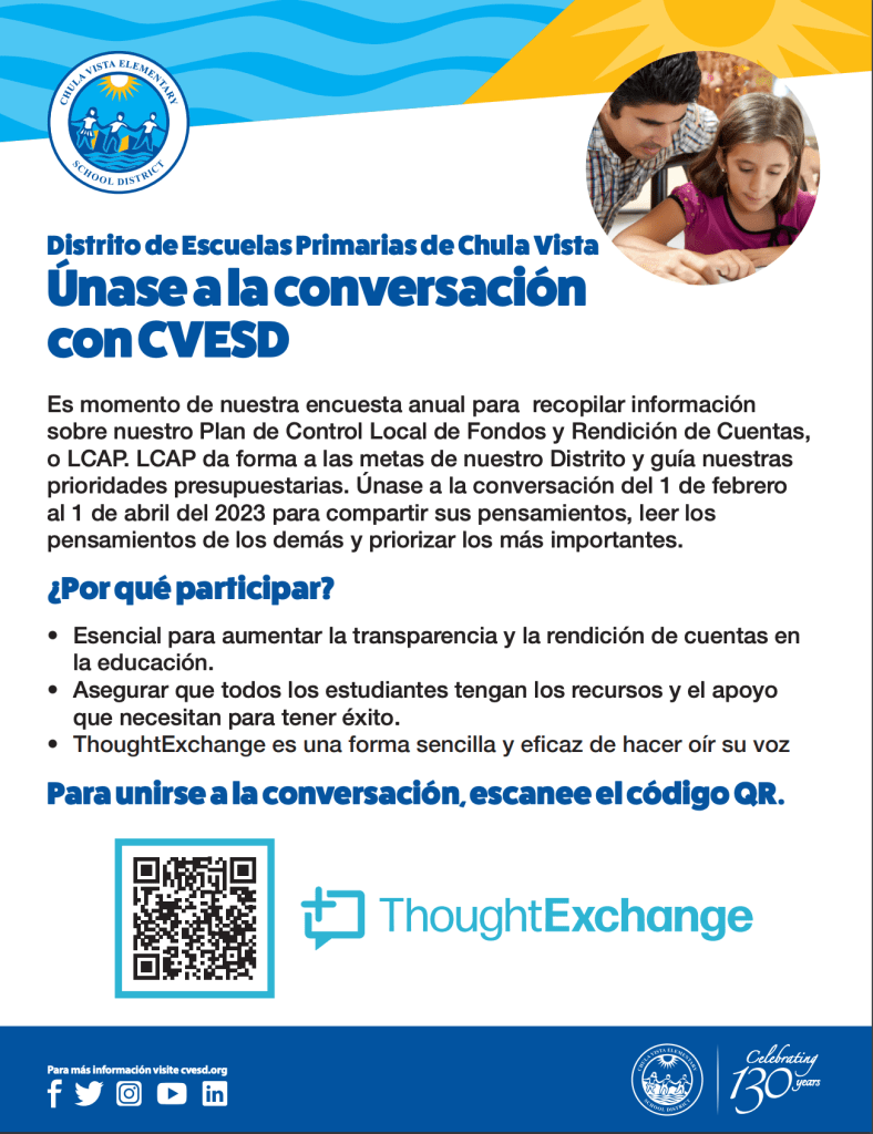Our annual ThoughtExchange for community input on the Local Control Accountability Plan (LCAP) is now open! Please see the flyer (in English and Spanish) for more information. This year, we are asking the question: What are some things we are doing well, and what could improve the educational experience we provide students through the LCAP?