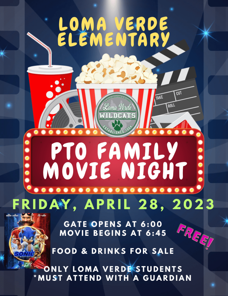 - Friday, 4/28 – 6:00 p.m. gate opens, 6:45 p.m. movie starts PTO Movie Night