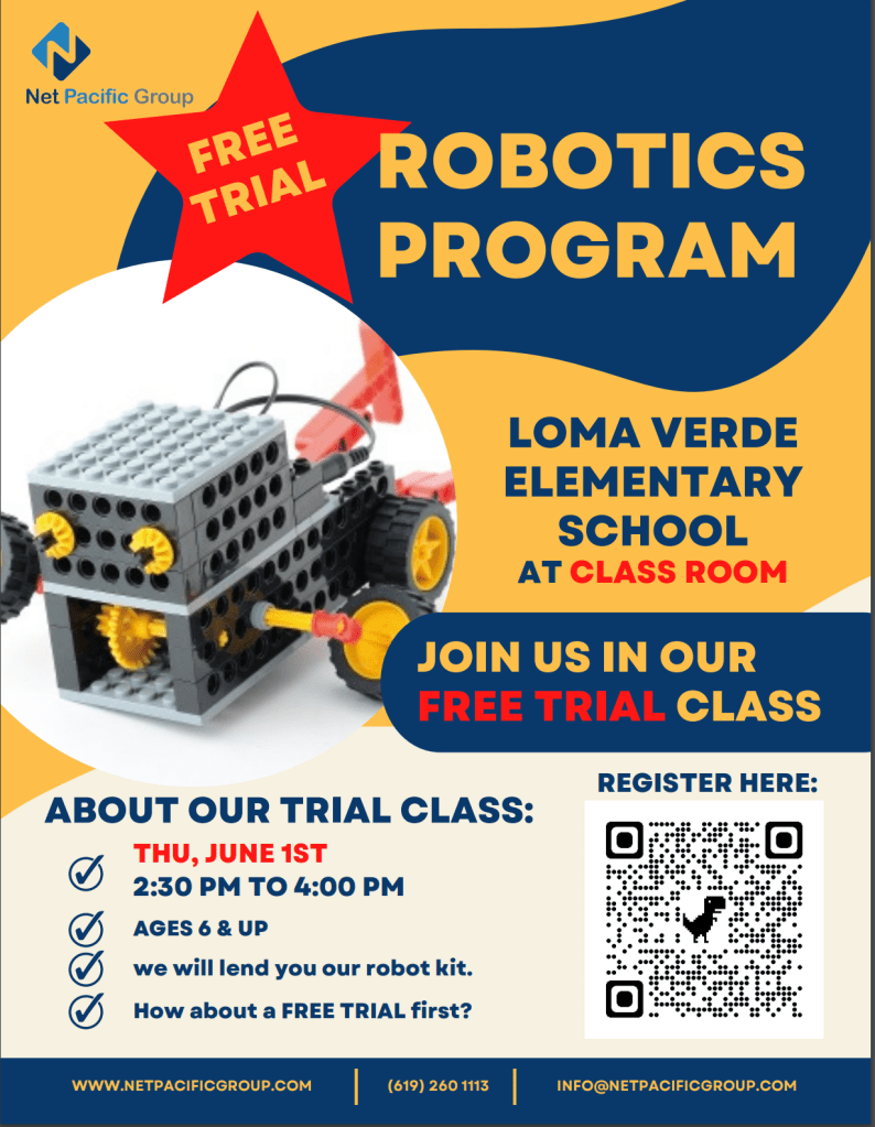 Click here to register for the free trial Robotics Class on Thursday, June 1 from 2:30-4:00.