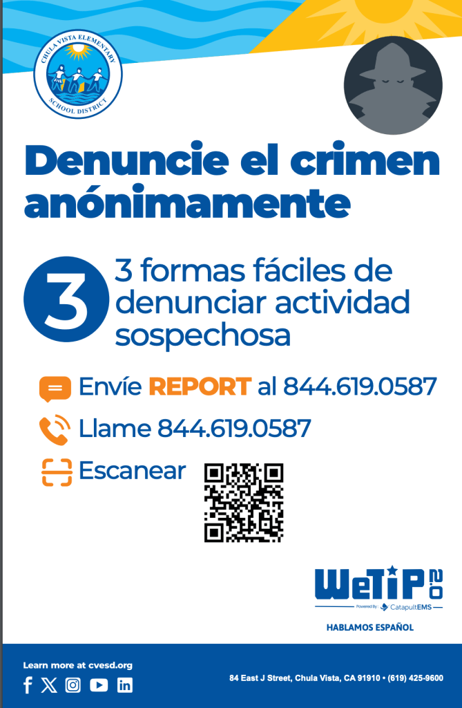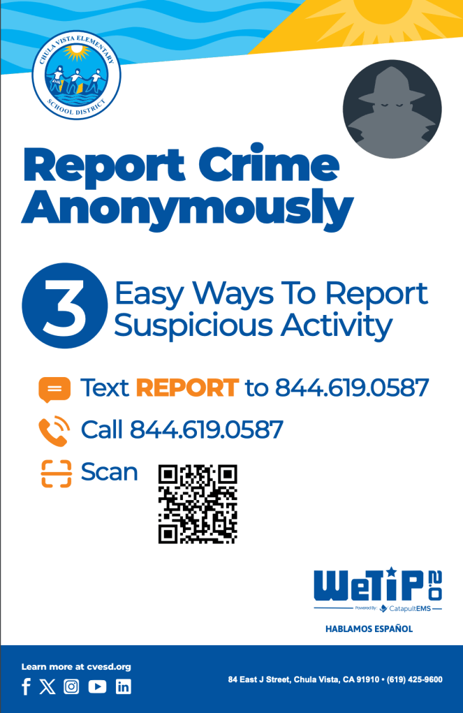 The Chula Vista Elementary School District (CVESD) is proud to introduce a new anonymous reporting program called WeTip which launched on November 1, 2023. WeTip will enhance safety at CVESD while actively empowering students, staff, and community members to maintain a safe and secure environment. The WeTip link to the anonymous report can be found here.
