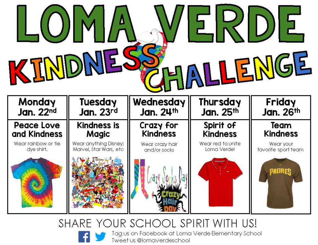 Loma Verde Elementary is participating again in the annual, worldwide Great Kindness Challenge! This is our third year participating as a school community. We invite all staff, students, and families at Loma Verde to participate in the official Great Kindness Challenge week this January 22 – 26, 2024.