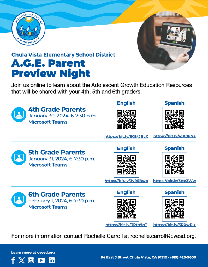 This month the district will begin hosting virtual adolescent growth education (AGE) parent previews. We are excited to announce there will be new curriculum for the topics this year. The sessions can not be recorded because of copyright laws, so be sure to take the time to review the materials at the meeting. The flyers with the links to the meeting times and dates can be found below and on the CVESD website.