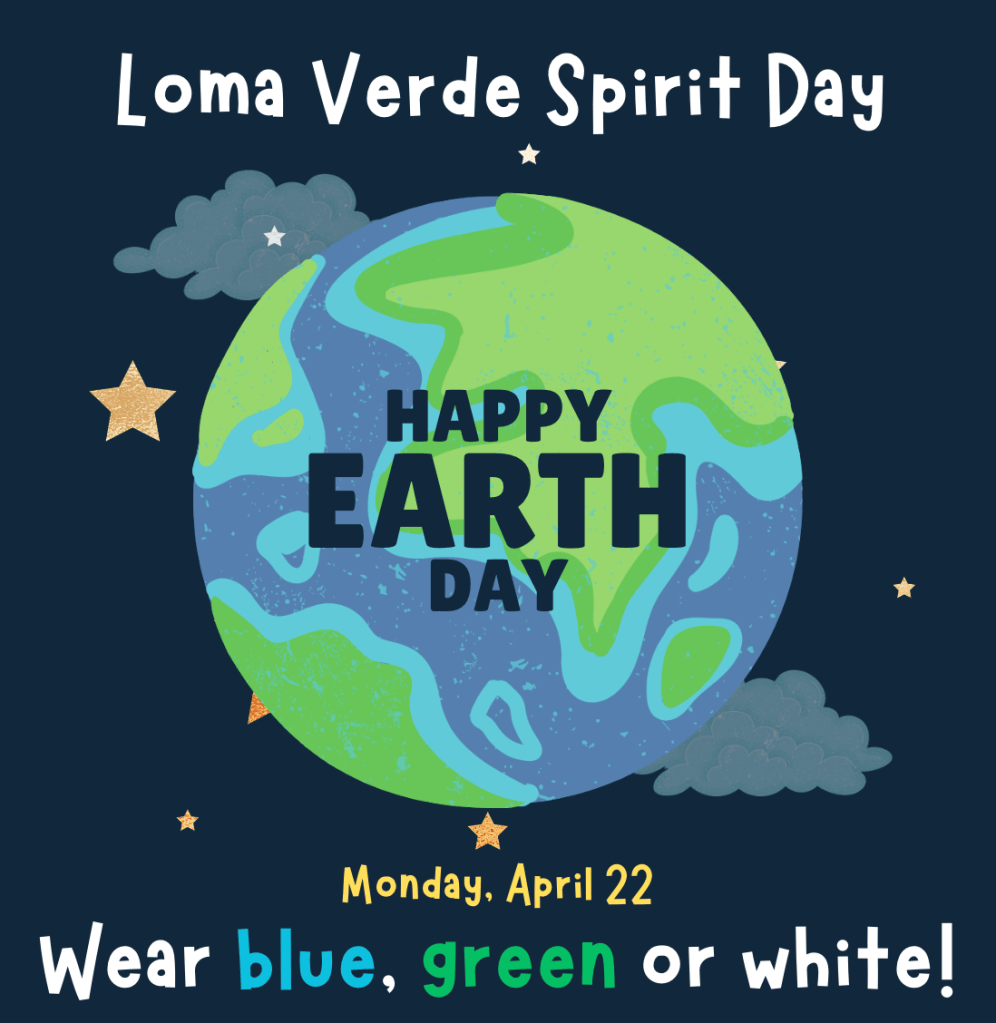 We are celebrating Earth Day on Monday, April 22 with a Spirit Day and Earth Day activities! Please send your child to school with a REUSABLE WATER BOTTLE (labeled with their name) and WEAR GREEN, BLUE, OR WHITE. Please send any pictures of our Wildcats participating in our Spirit Days to bree.watson@cvesd.org.