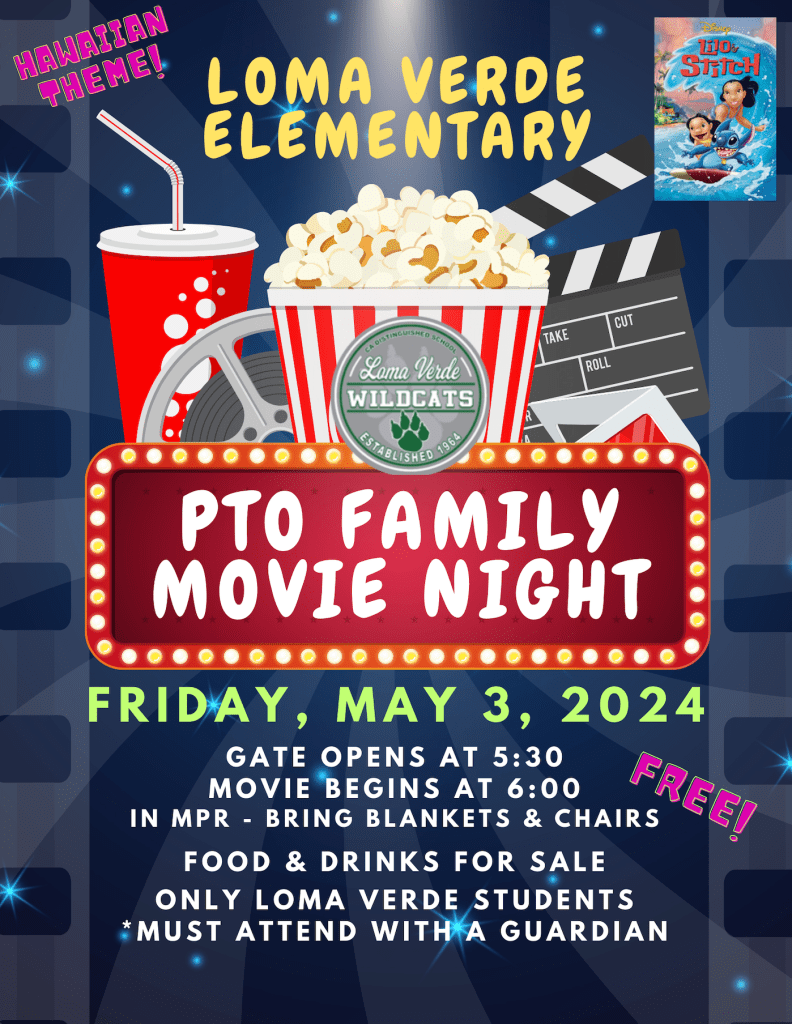 Please join us on Friday, May 3rd for our free PTO Spring Family Movie Night! Doors will open at 5:30 and the Lilo & Stitch movie will begin at 6:00. This Hawaiian-themed event will have food for sale. Bring a blanket, pillow, or lawn chair, and enjoy the movie with your child in our MPR/auditorium. Only Loma Verde students and their parents/guardians are allowed. Space is limited for this movie night because it is being held indoors. Sign up here https://forms.office.com/r/8HKTMnr73L to let us know who will be attending. Volunteers are needed to help with food sales. Please contact the office if you are available to help. Thank you!