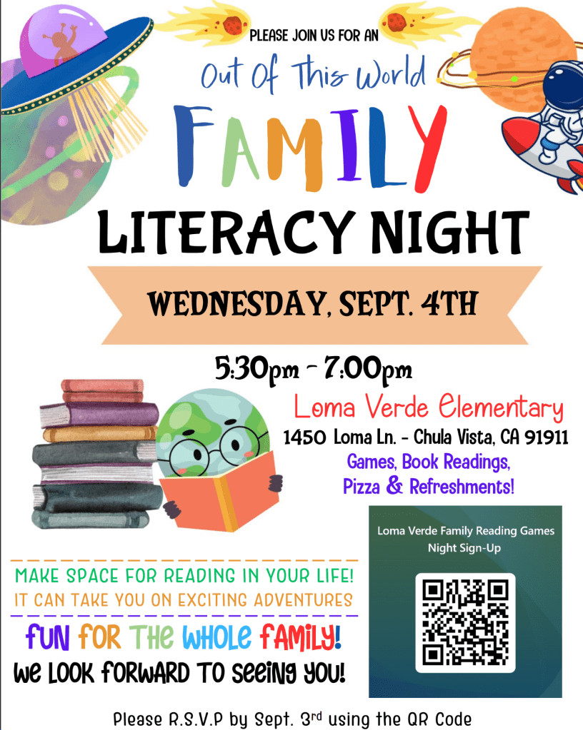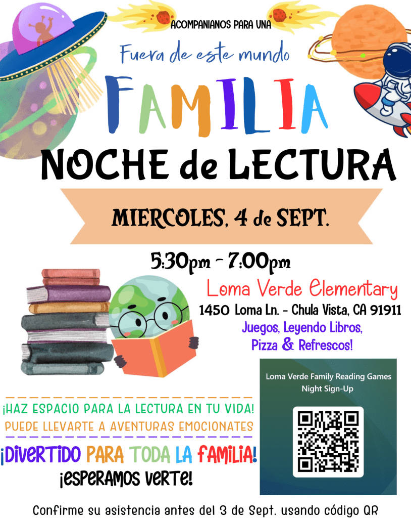 Please let us know who is coming to the FREE Loma Verde Family Reading Games Night on Wednesday, 9/4 5:30-7:00 p.m. CLICK HERE to fill out one form for the family. Thank you!