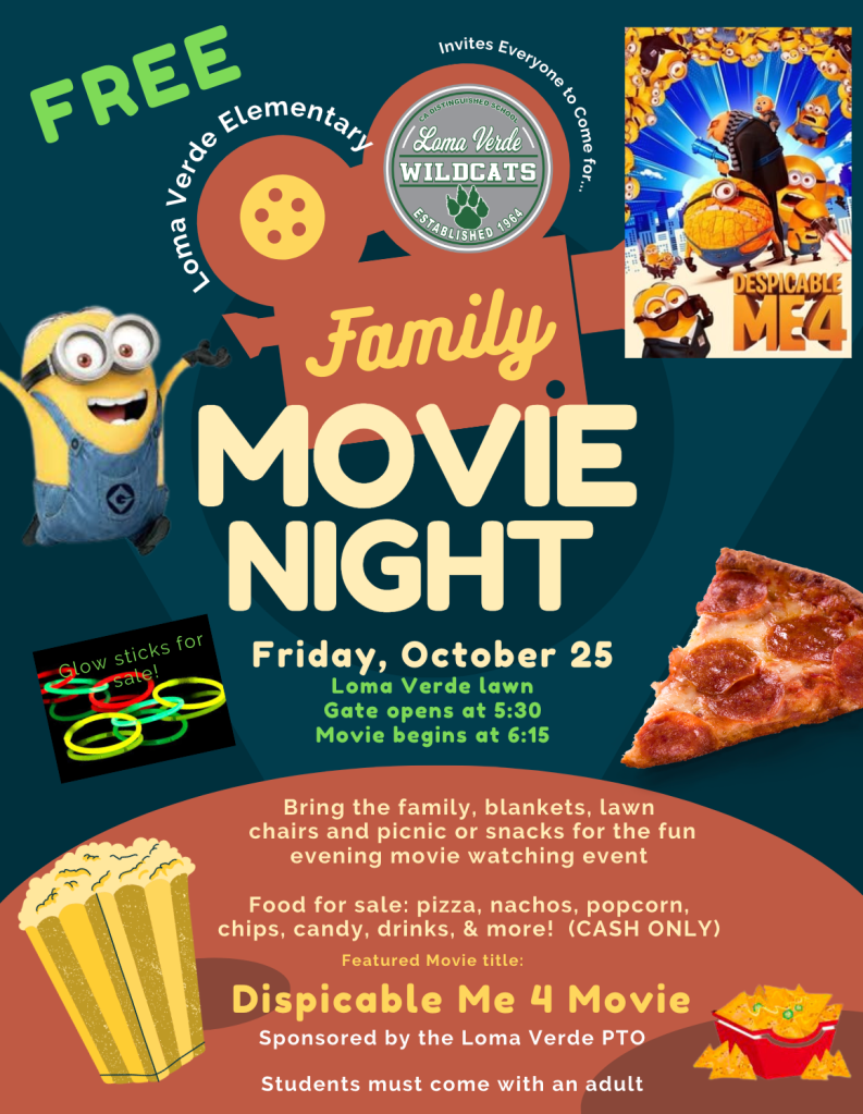 Join us on Friday, 10/25 for the Loma Verde Family Movie Night under the stars! The gate opens at 5:30 p.m. and the movie begins at 6:15 p.m. Bring blankets and chairs for an outdoor showing of the Despicable Me 4! Food will be for sale OR bring your own picnic. Students must be accompanied by an adult. All Loma Verde students and their parents/guardians are welcome to attend this FREE PTO event!