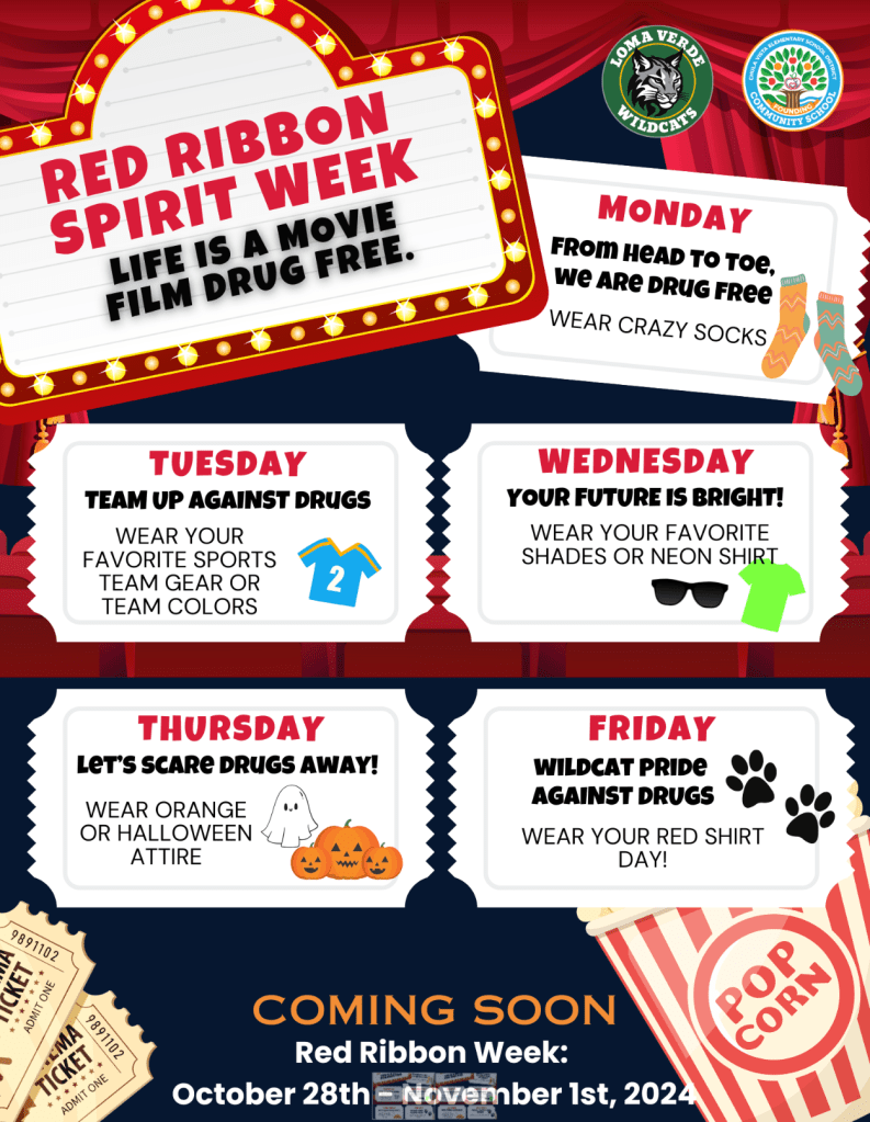 It’s Red Ribbon Week and Loma Verde Spirit Week! Please watch the short video about why we have Red Ribbon Week and see the information below for our Loma Verde Spirit Days.