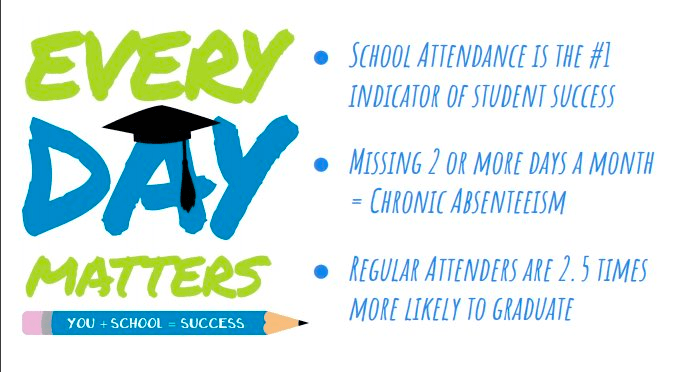 REMINDER: Students need to be at school every day, arrive on time (before 8:00 a.m.), and stay in school for the entire day.