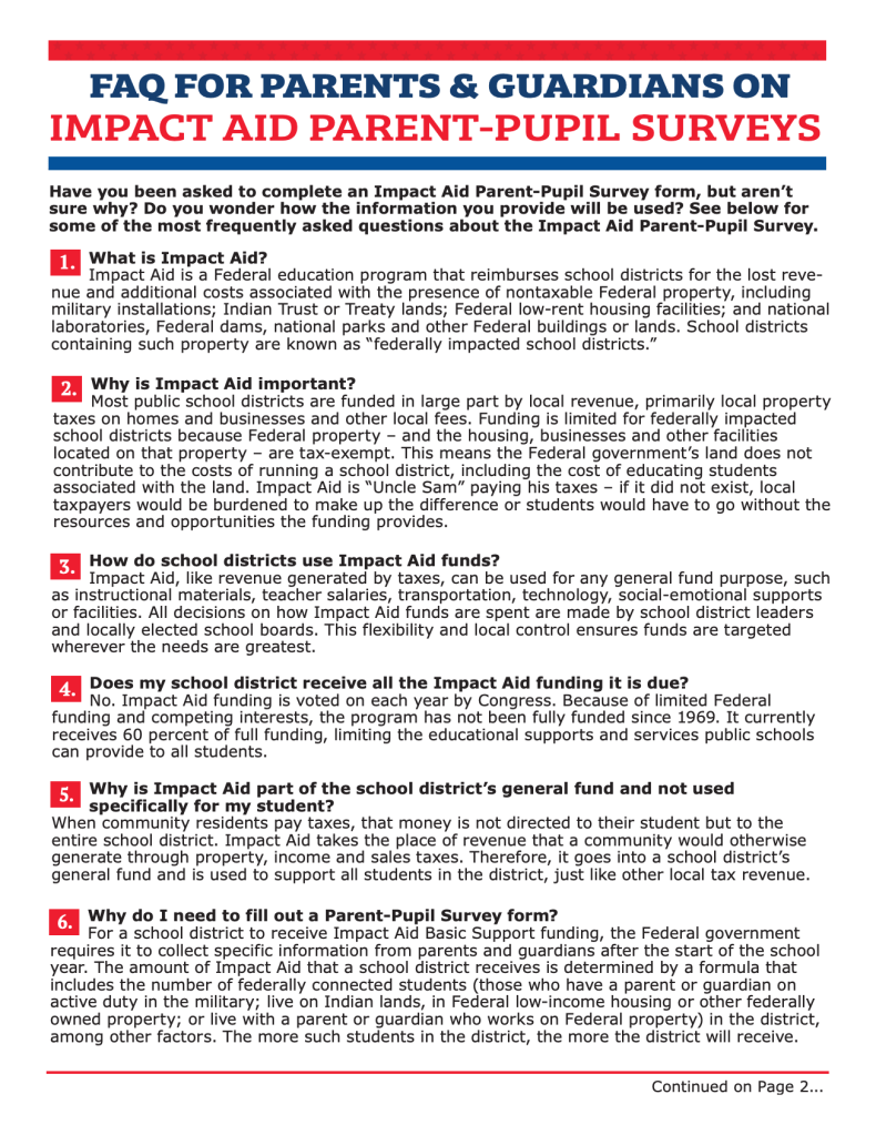 Federal funds are provided to the school district based on the number of students enrolled in our schools whose parents/guardians reside or work on Federal Property or are on active duty in the military. Forms will be sent home on Monday, November 4, 2024. Please send the completed form by email to lomaverdeschool@cvesd.org or drop it off at the school office Monday-Friday between 7:30-4:00. See below for more information about the forms. Thank you!