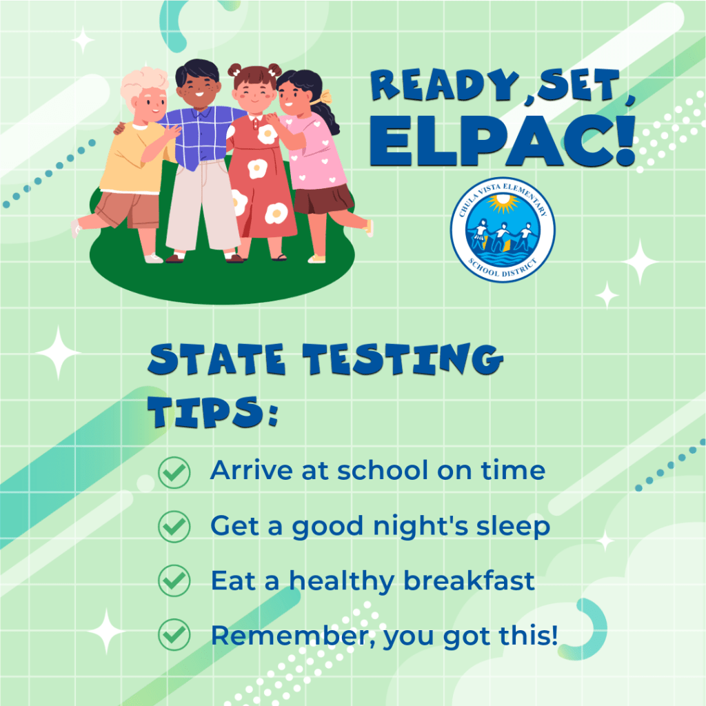 The English Language Proficiency Assessment for California (ELPAC) testing is going on now. If your child is an English learner, they will be tested between February 3rd and March 21st.