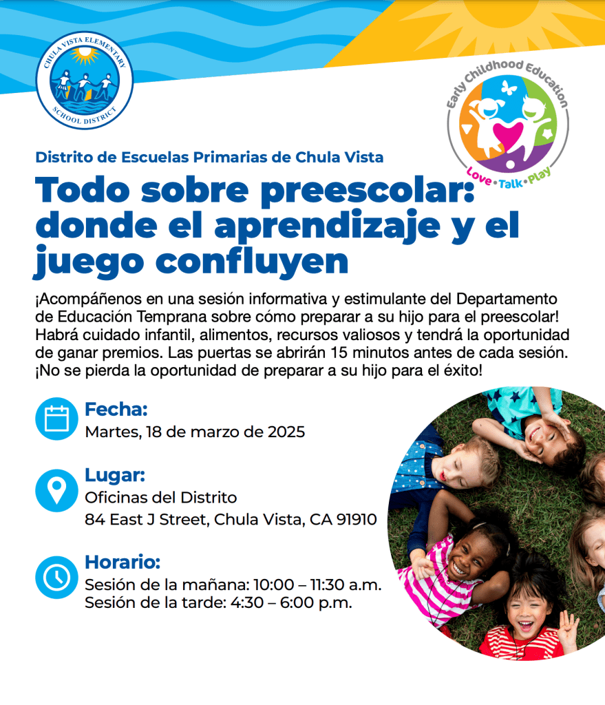 - Tuesday, 3/18 10:00-11:30 All About Preschool – Morning Session @District Office at 84 East J Street