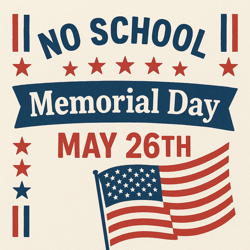Just a quick reminder that there will be no school on Monday, May 26, in observance of Memorial Day. We hope you enjoy the long weekend and take a moment to honor the brave men and women who have served our country. 🇺🇸 We’ll see everyone back at school on Tuesday, May 27—ready to learn and finish the school year strong! Have a safe and happy holiday weekend!