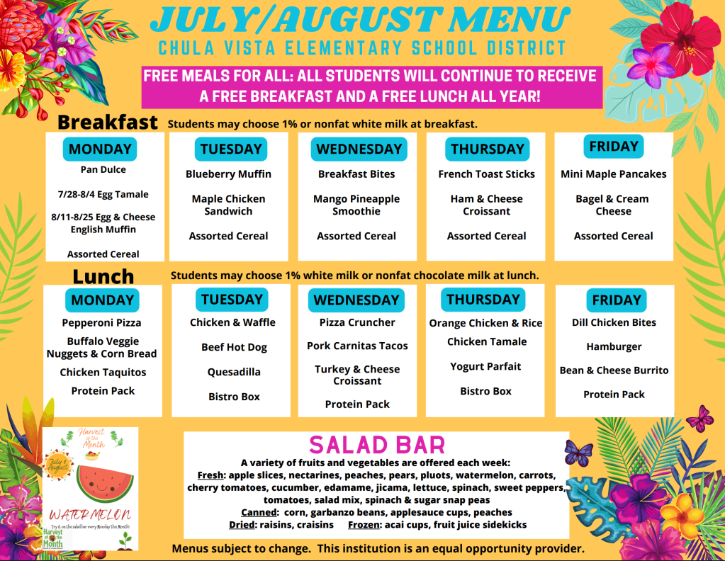 FREE breakfast is available from 7:15 a.m. to 7:55 a.m. If students miss breakfast, Second Chance Breakfast is available during the first recess.