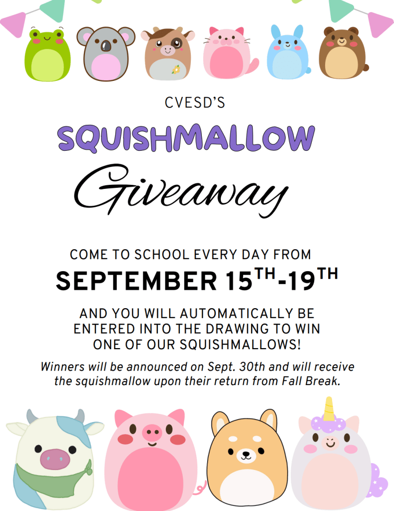 Students with perfect attendance from September 15–19 will be entered into a drawing to win a Squishmallow—let’s finish strong and make it a great week!