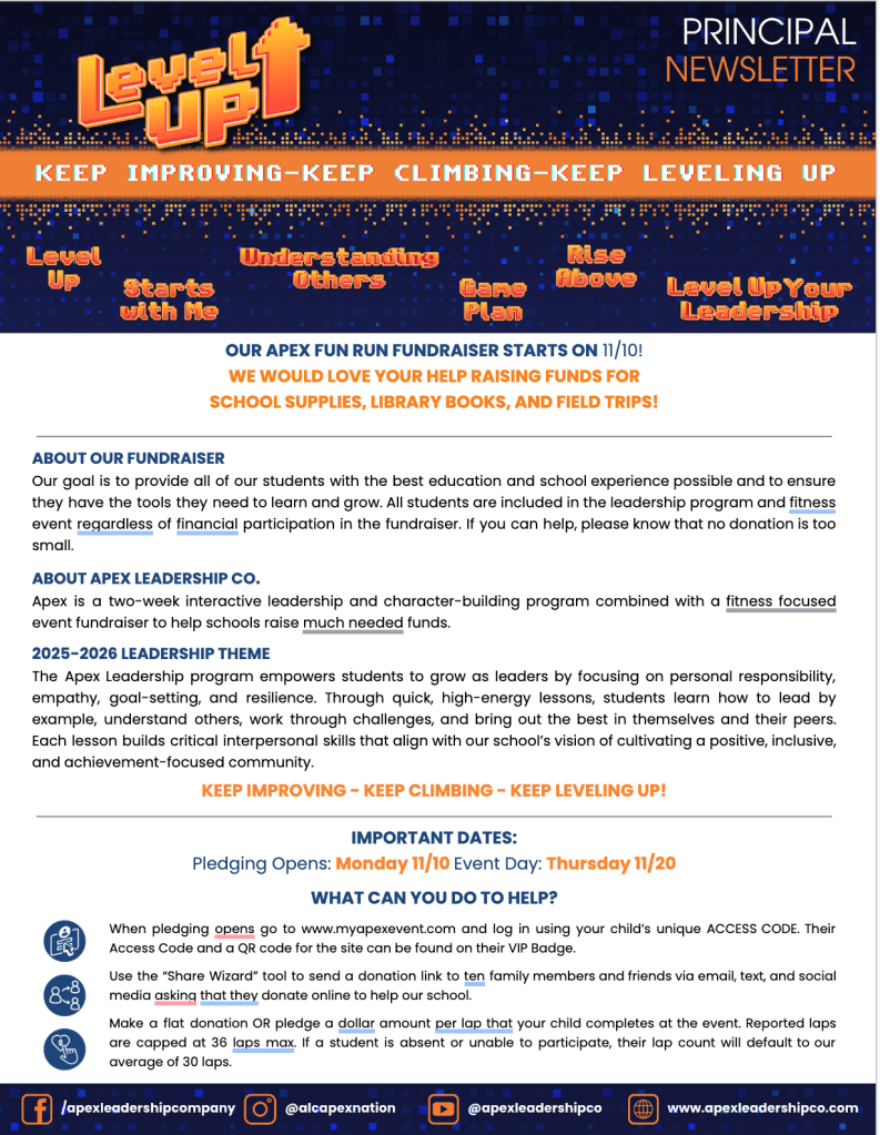 🌟 Get ready to LEVEL UP! Our @ApexLeadershipCompany Fundraiser kicks off on Monday, 11/10/25, and this year’s theme is “LEVEL UP”! 💫 Not only are we raising funds for our school, but our students will also be diving into leadership habits essential for becoming Future Leaders! Stay tuned for updates on how you can support our cause and empower the next generation of leaders! 👩🎓👨🏫 #ApexFuture #LeadershipDevelopment #SupportOurSchool