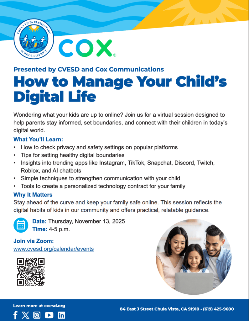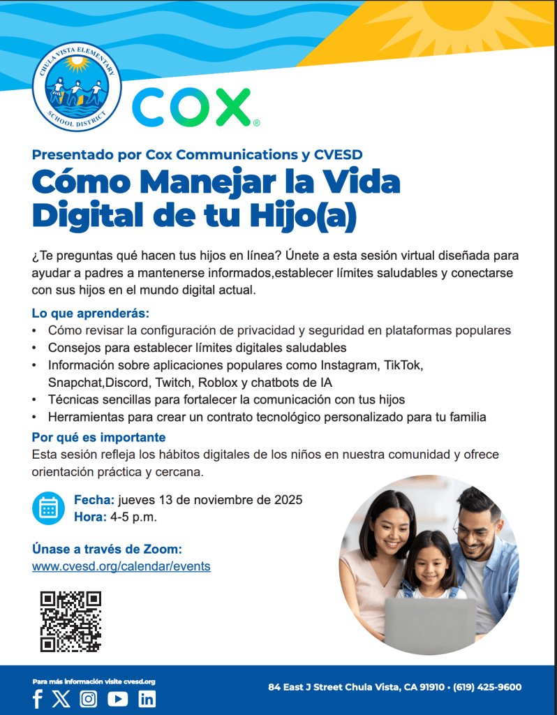 - Thursday, 11/13 4:00-5:00 PM How to Manage Your Child’s Digital Life parent presentation online Zoom: http://www.cvesd.org/calendar/events