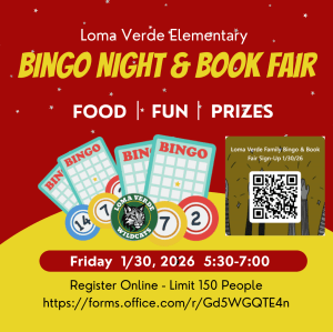 Mark your calendars for our second annual Loma Verde Family Bingo Night and Book Fair on Friday, 1/30 from 5:30-7:00 in the auditorium and library.