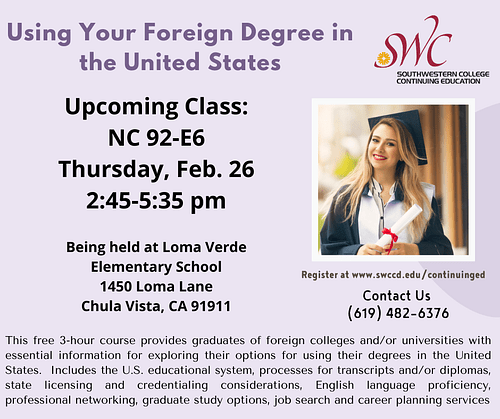 - Thursday, 2/26 2;45-5:35 Southwest College FREE Community Class “Using Your Foreign Degree in the U.S.” @403