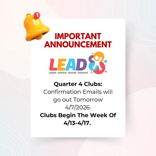 - Monday, 4/13 4th Quarter LEAD Clubs begin