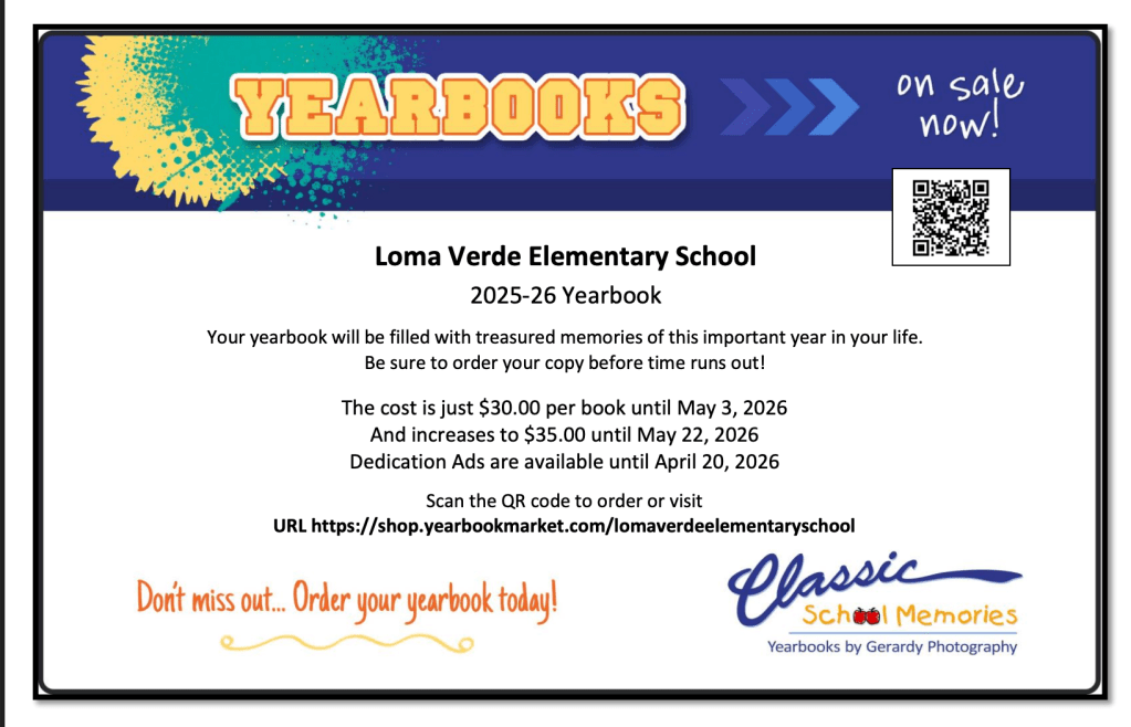 We are selling Loma Verde spirit shirts and hoodies at school. The T-shirts are $15 and the sweatshirts cost $33. (Cash only at this time.) Students can wear the spirit t-shirts and sweatshirt any day of the week OR the uniform shirt. Order forms can be picked up in the office or click here. Let’s show our school spirit, Wildcats! Please make sure to write your child’s first and last name inside their hoodie.