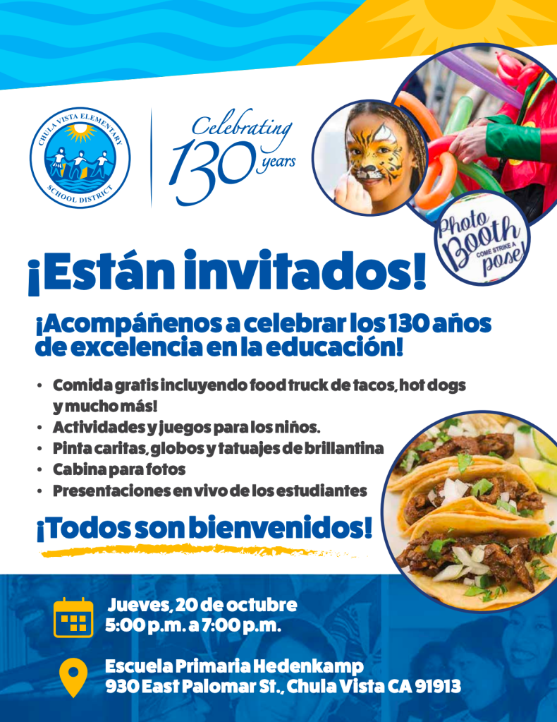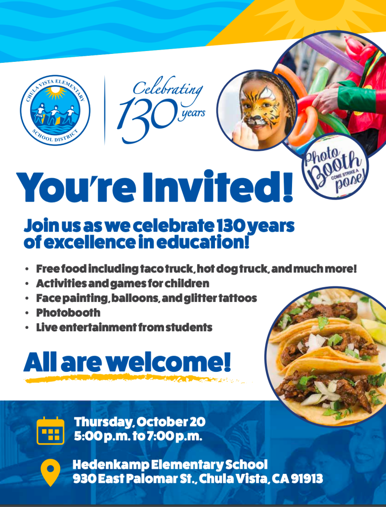 On October 20, 2022, the Chula Vista Elementary School District will host a 130th-anniversary celebration event at Hedenkamp Elementary School for all community members to attend. The free event will take place from 5 pm to 7 pm, where we will recognize students, staff, and individuals who have impacted the District over the years. We look forward to celebrating with you then.