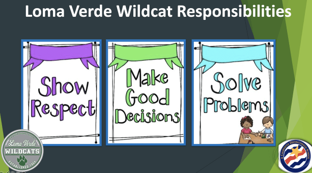 Our Loma Verde Wildcats have been learning what it means to be a Wildcat the past several weeks. Our 3 Personal Standards help make Loma Verde a wonderful place for our students to learn and grow. Please review the traits with your children. We are always looking for Wildcats that go above and beyond demonstrating the 3 Personal Standards: Show Respect, Mark Good Decisions, and Solve Problems! We look forward to recognizing our Wildcats of the Week on Monday at our Blacktop Character Assembly! Please keep encouraging our Wildcats to be their best selves each day!