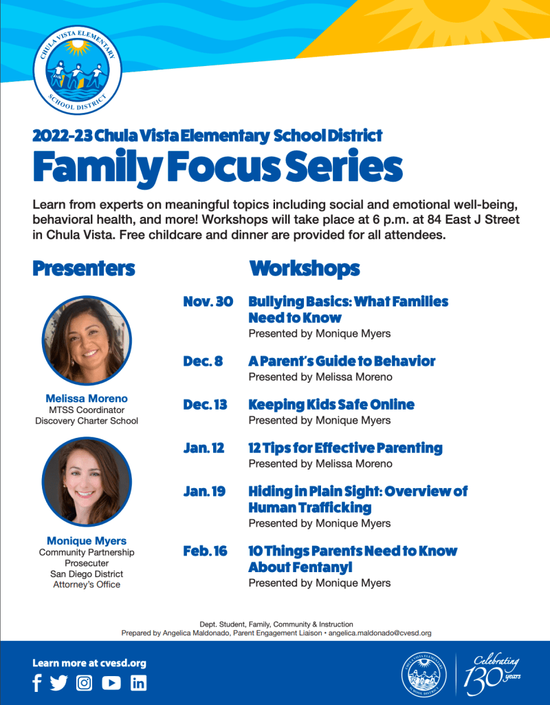 The Chula Vista Elementary School District is starting a new Family Focus Series for families to learn more about pressing topics such as bullying, social and emotional well-being, and more! This is a wonderful learning opportunity for our families to participate in upcoming workshops. Check out all the topics below! Free childcare and dinner are provided for all attendees. The next workshop is on January 12. The MTSS Coordinator for Discovery Charter School, Melissa Moreno, will present “12 Tips for Effective Parenting.”